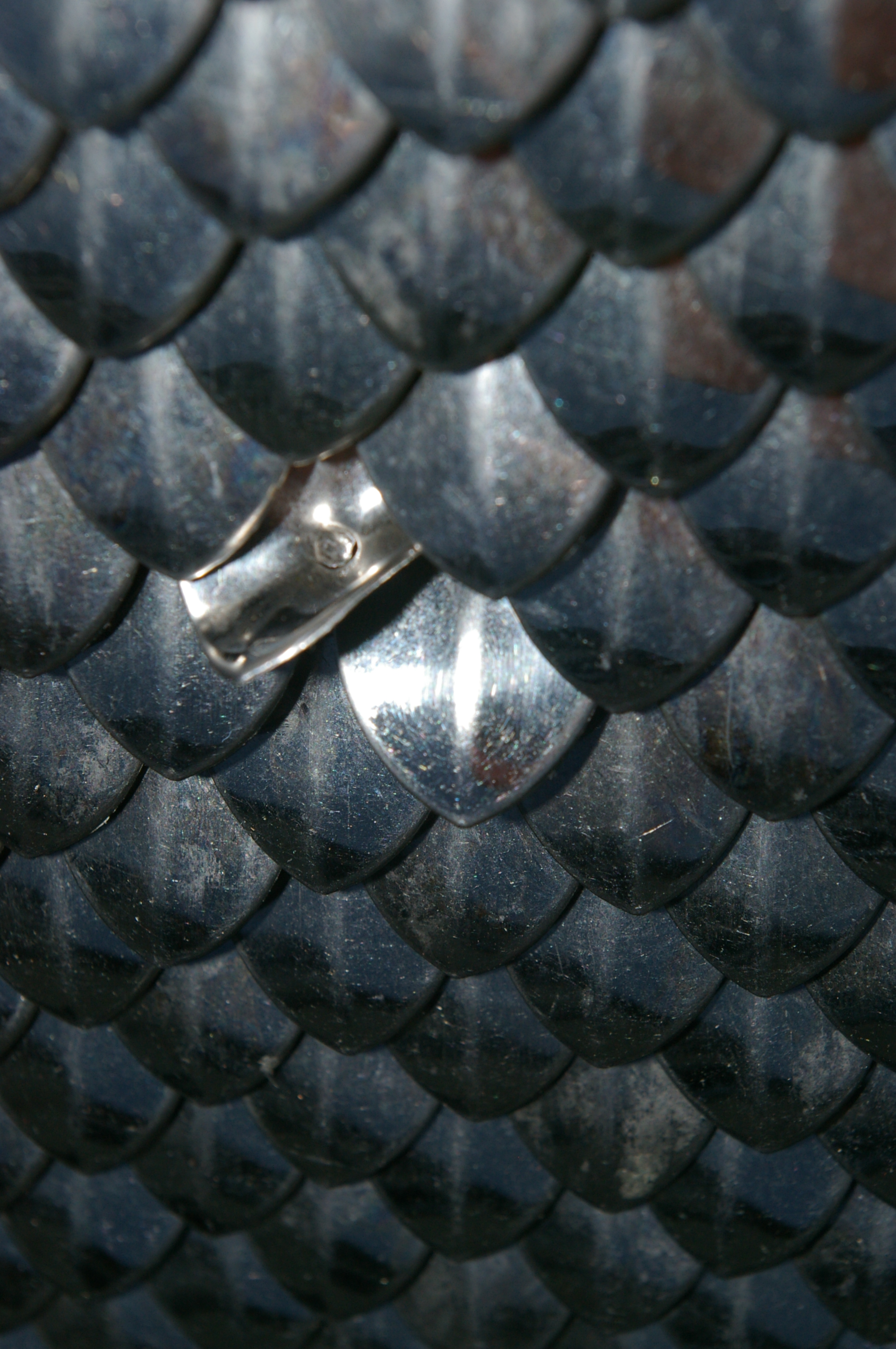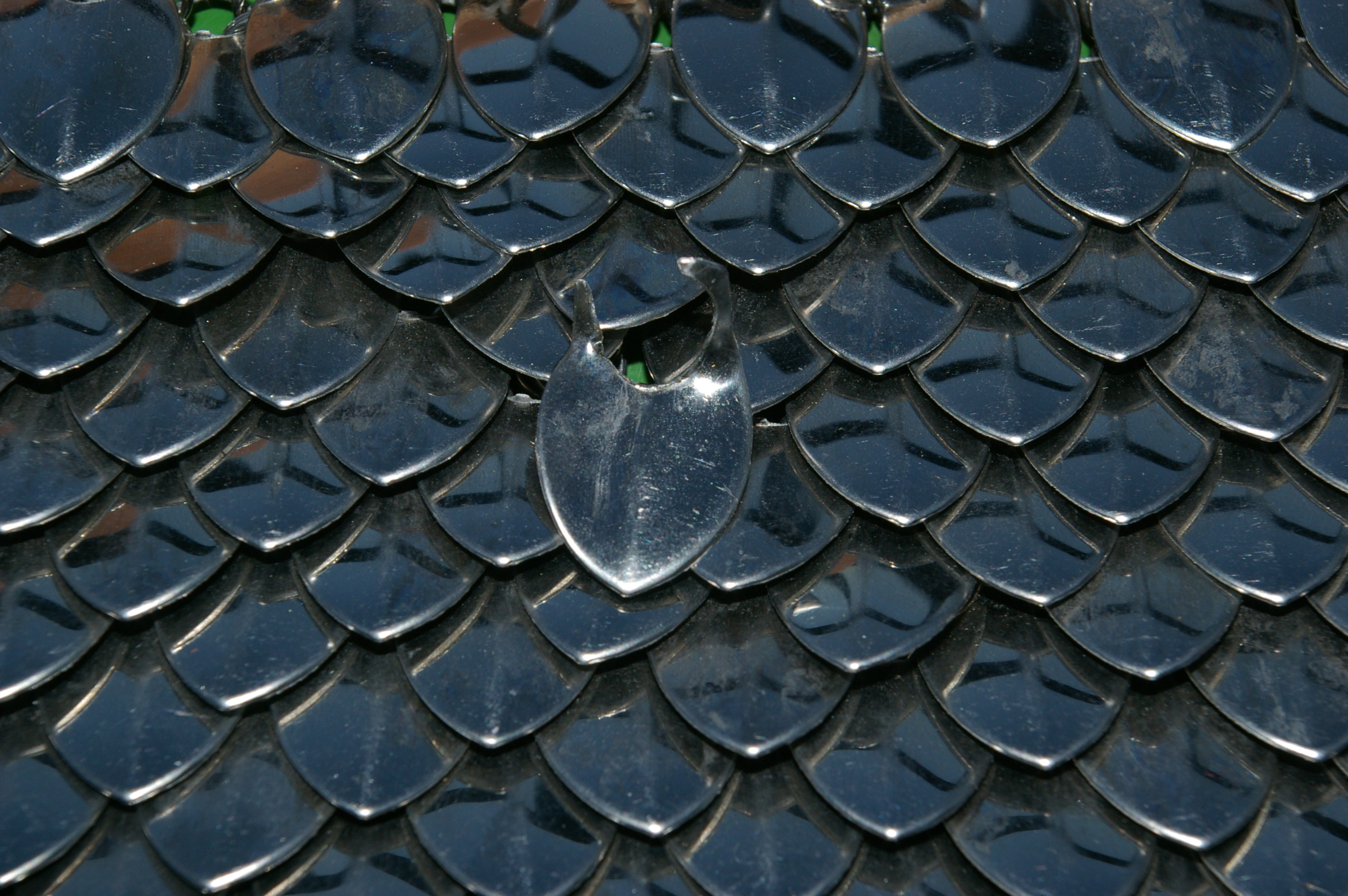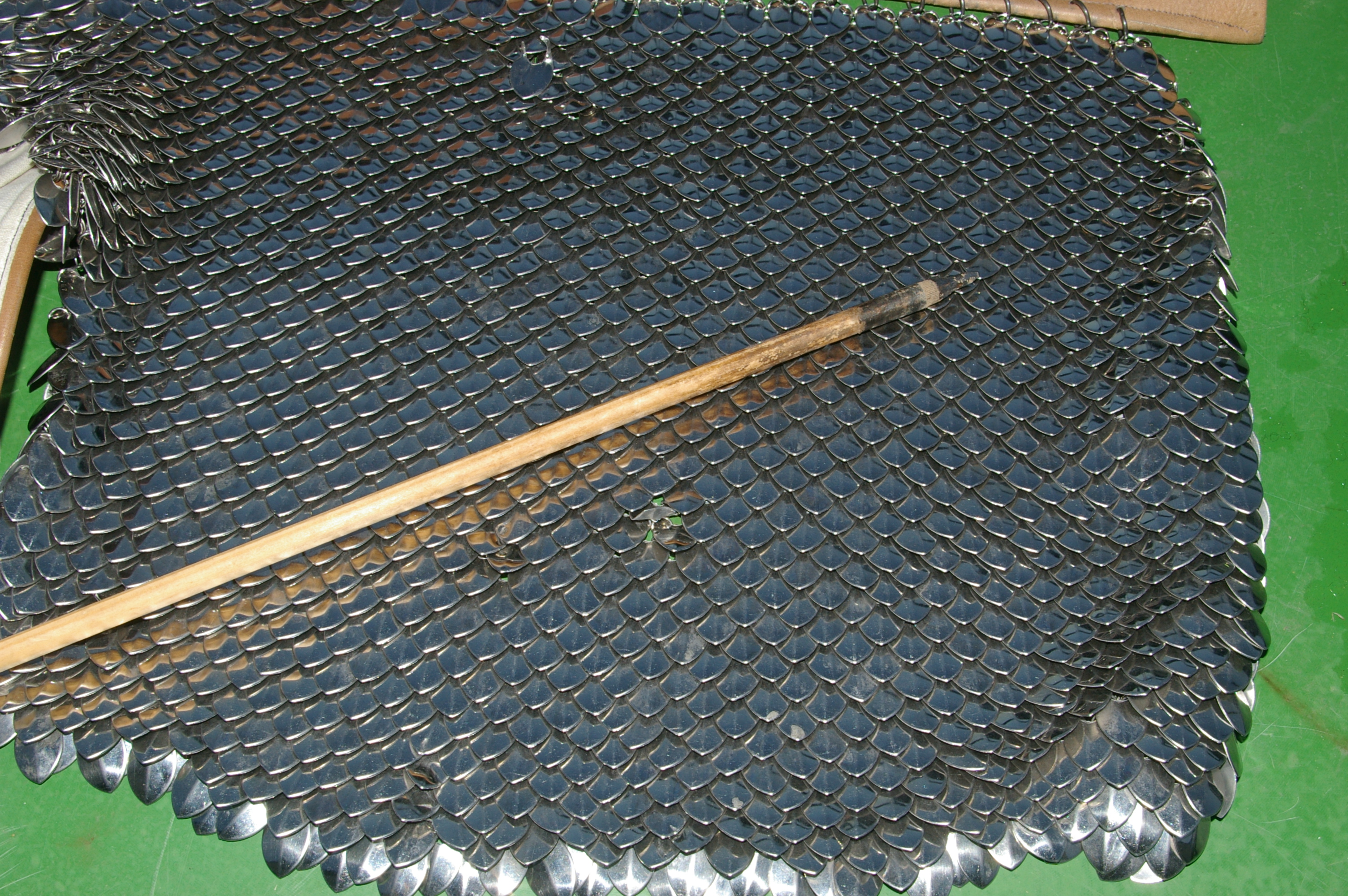 Hier das Ergebnis: Die getroffene Schuppe total zerbeult, aber alle Ringe sind intakt. Der Pfeil prallt ab