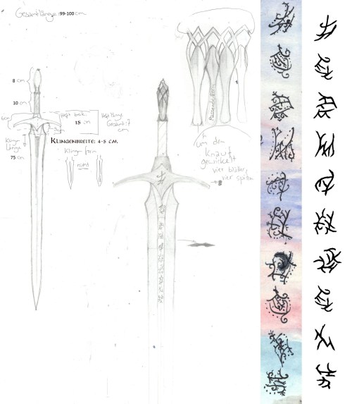 Gestern habe ich ausserdem mit Mimins Hilfe den Entwurf für Elrians Langschwert in einen Entwurf für ein Breitschwert umgewandelt. Sowohl Heft als auch Klinge sind nun erheblich kürzer (etwa 100 cm)