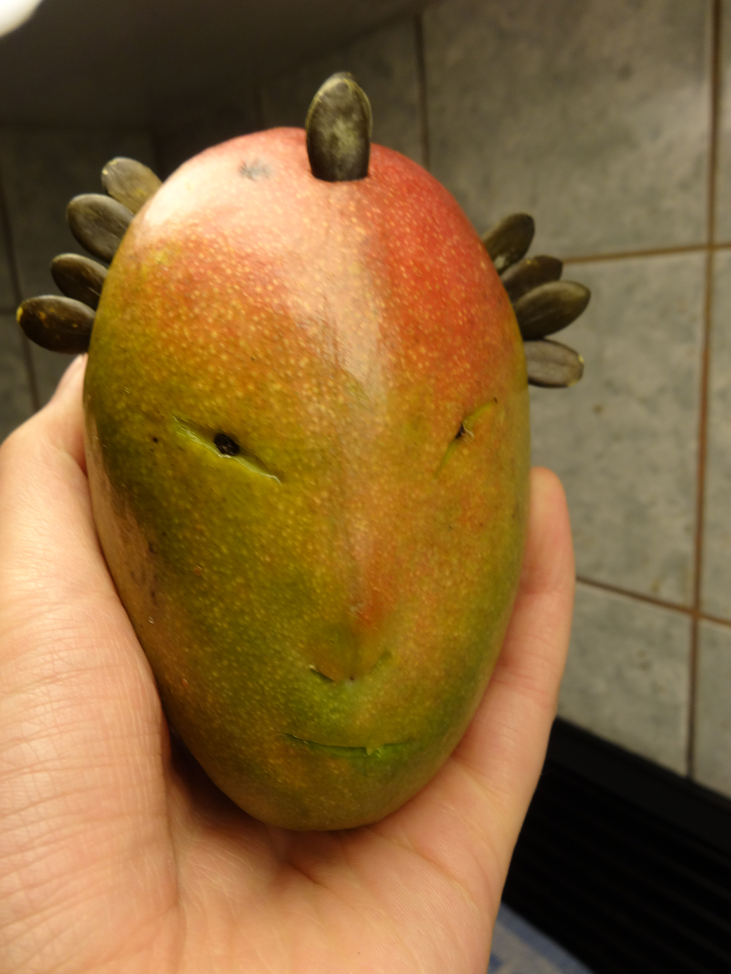 This is nothing interesting, really. Just a mango with a friendly alien face.
