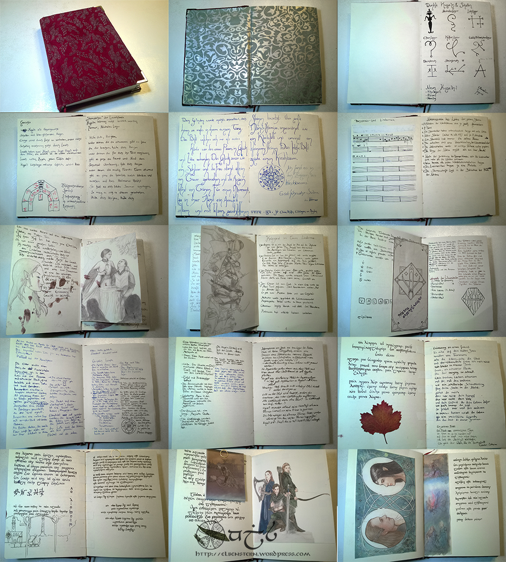 But after while I started to put in personal stuff that went through my characters head. Its purpose is now to collect both information about plot (which will be written in normal writing) and personal notes (written in Tengwar). And I am planning to make its style a mix of the current design and River Song’s Diary from Doctor who.