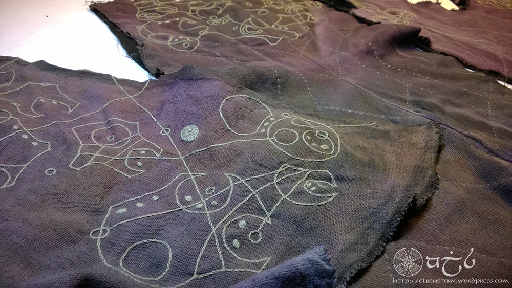 The Costume will consist of a thin green Robe, a silly hat and this… thing. Its a second Robe, made from hand-dyed noil silk, lined with wool (I need it to be warm) and hand embroidered. The circles are actual writing in Circular Gallifreyan.