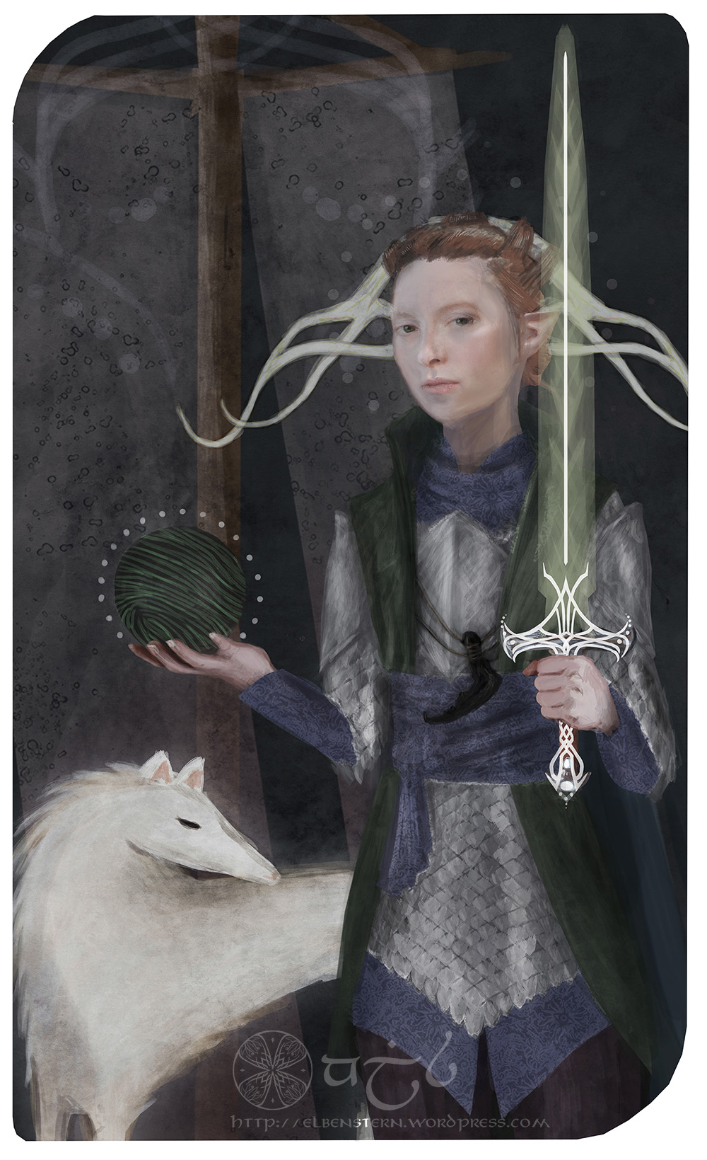 I tried to mirror some of my first playthrough’s choices in here: The Night Enchanter’s Spirit Blade, Heavy Armour, Solas’ Necklace (an the wolf from his romance card) as well as the Orb that “misplaced” the anchor on her hand.