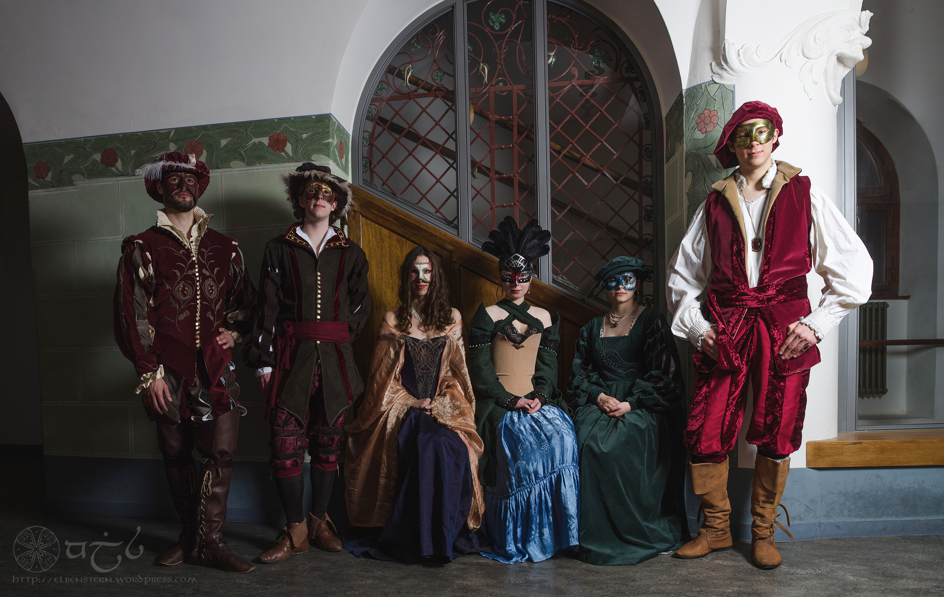 Moritz Jendral took this lovely photo of our Group of Characters, with me right at the centre. It is the first one I have of the gown I started planning back in December. It’s mostly influenced by the Orlesian ball gowns featured in Dragon Age Inquisition. It also has an animal theme: A black Swan.